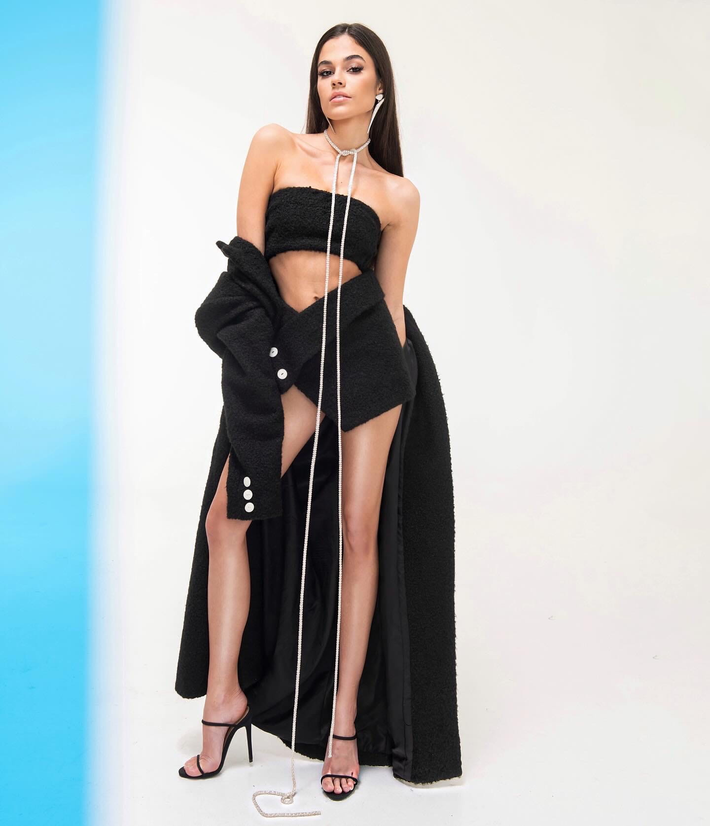 Modelka ma 170cm wzrostu, prezentuje na sobie rozmiar XS