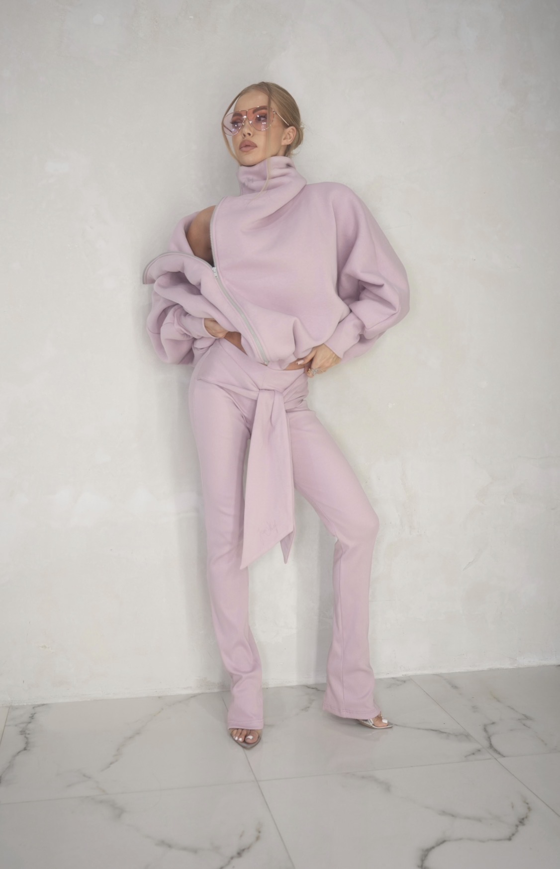 Model z lekko obniżonym stanem (na wysokości pępka) oraz asymetrycznym, sportowym wiązaniem w pasie, które nadaje całości nowoczesnego charakteru. Całość dopełnia subtelne logo w kolorze jasnoszarym, podkreślające minimalistyczny, premium styl.