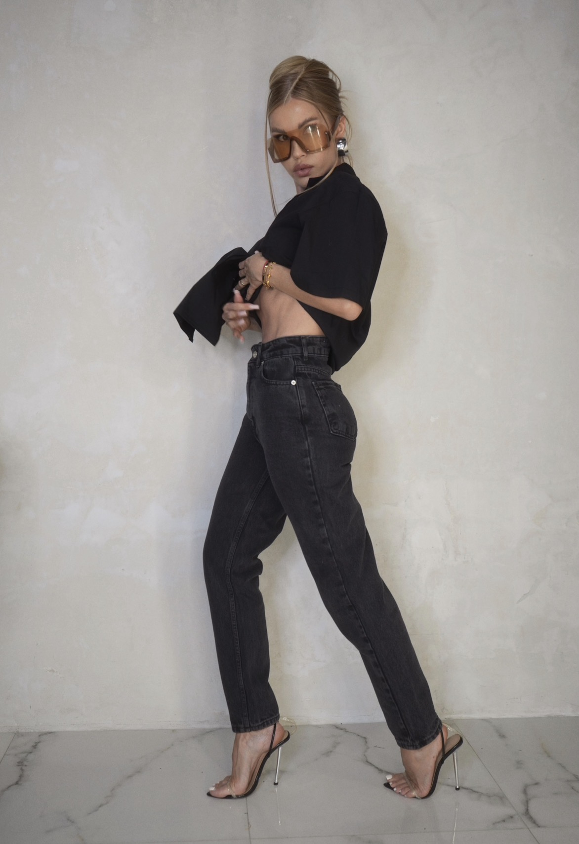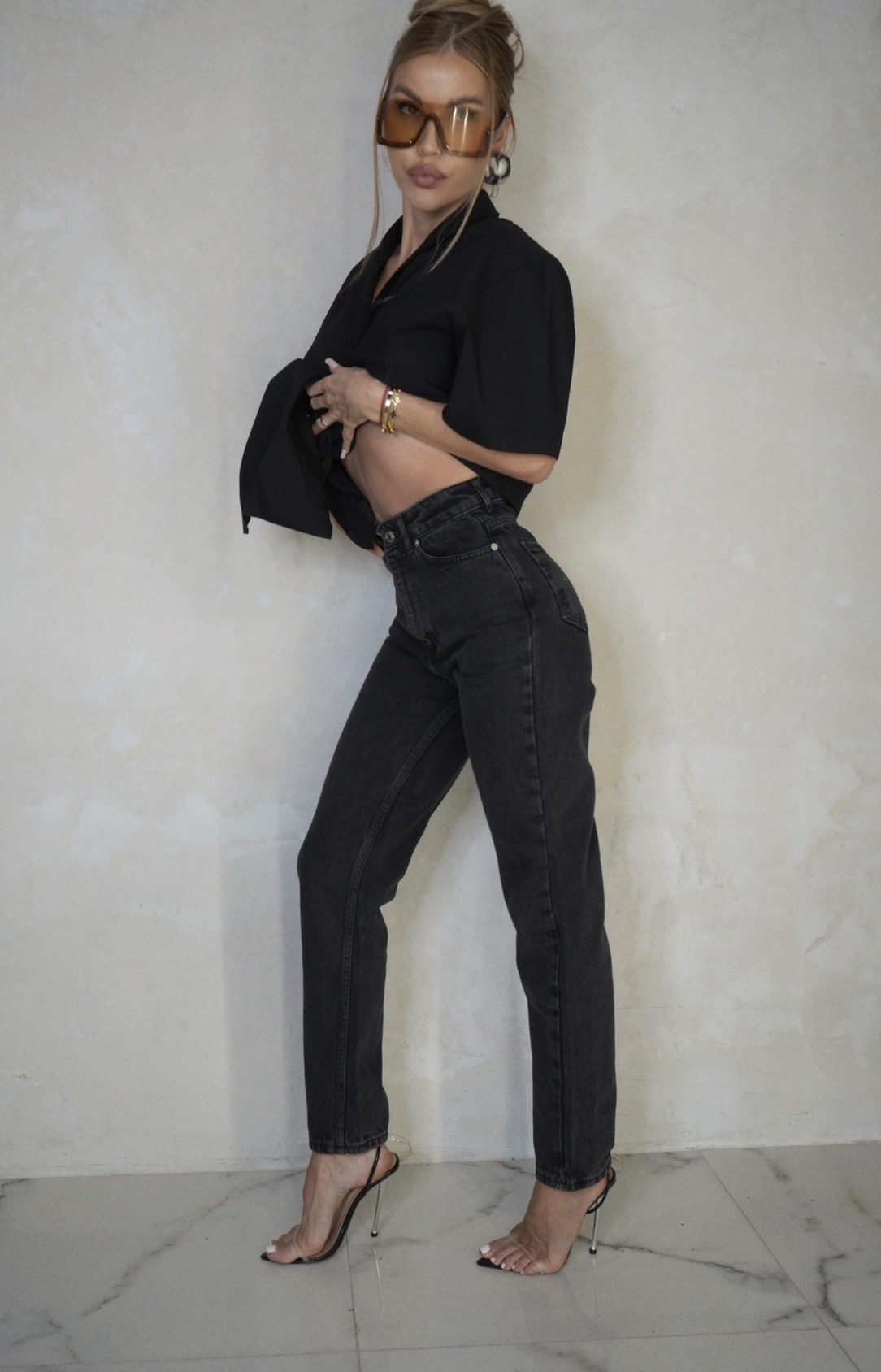 Ponadczasowe czarne jeansy o prostym kroju z kobiecym, wyższym stanem, który pięknie podkreśla talię i optycznie wydłuża nogi. Model został wykonany z wysokiej jakości bawełnianego denimu z delikatnymi przetarciami, które dodają charakteru, zachowując jednocześnie elegancki, minimalistyczny wygląd.