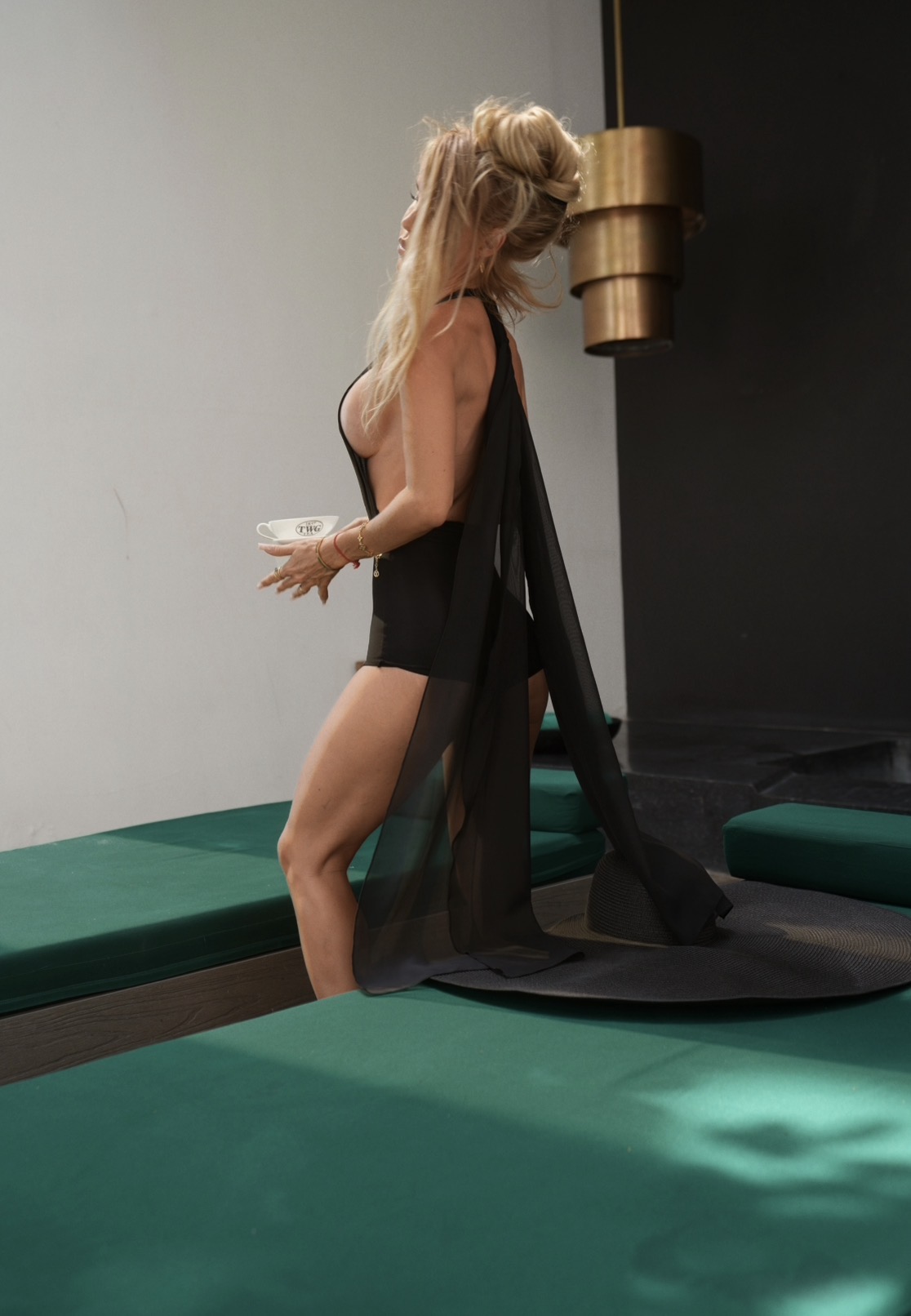 Dół jest bardzo elastyczny i dopasowuje się do sylwetki, a góra regulowana wiązaniem na szyi i z tyłu.