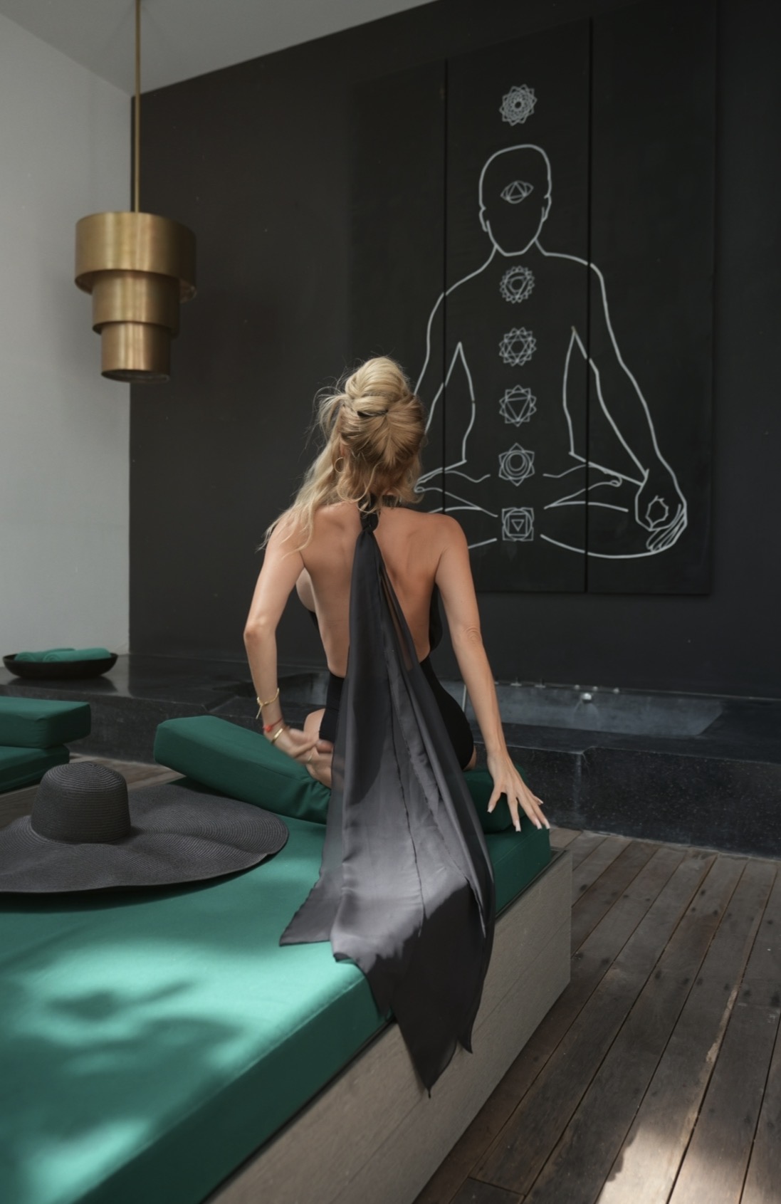 Góra to wiązany na szyi top z efektowną szarfą z tyłu.