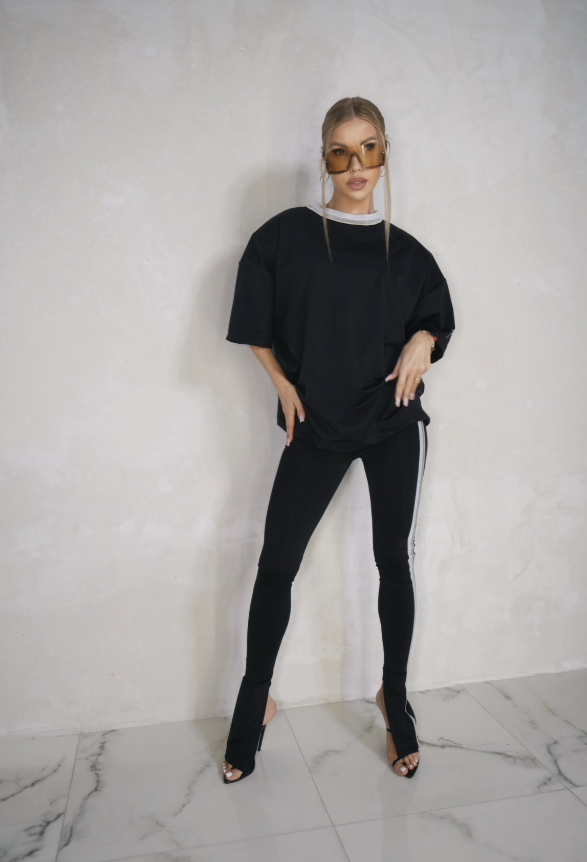 Po lewej stronie wszyty został ozdobny ściągacz w kolorze szaro-beżowym, biegnący wzdłuż nogawki, który optycznie wysmukla nogę i nadaje całości nowoczesnego, sportowo-fashion charakteru. Dół nogawek wykończony został delikatnym rozcięciem, które wydłuża sylwetkę i pięknie układa się na bucie.