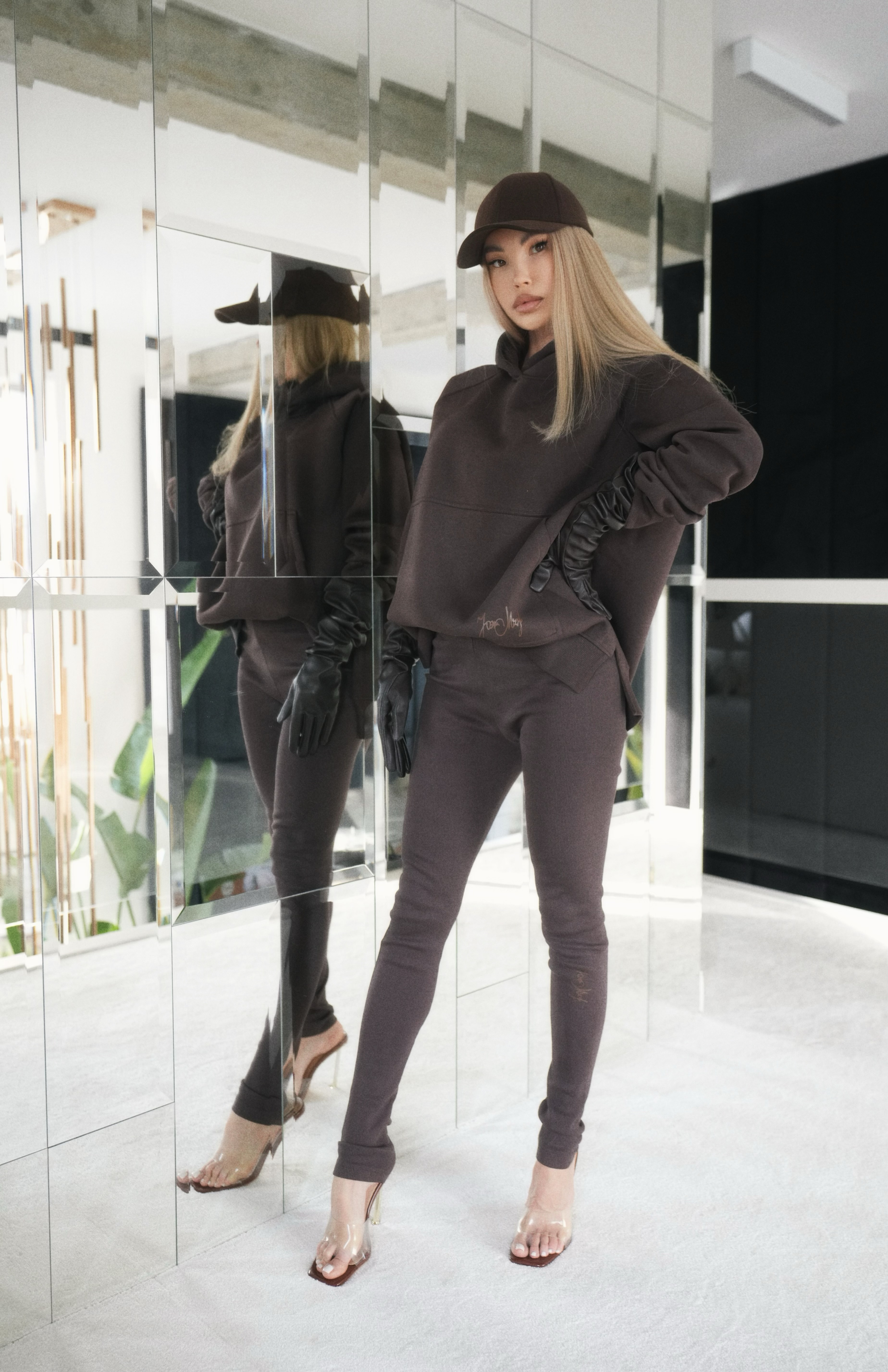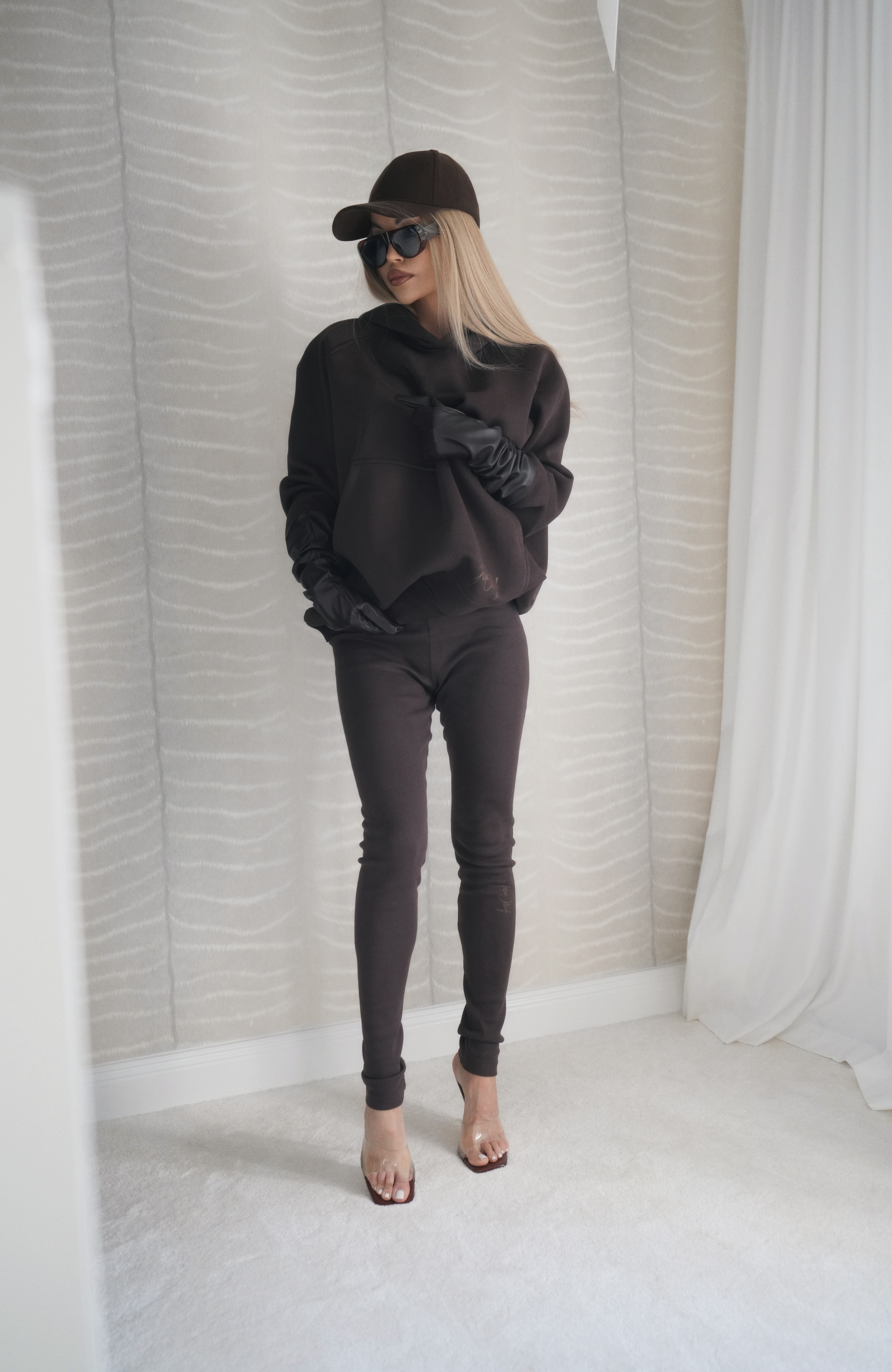 - Logo: brązowe — z przodu i na kapturze