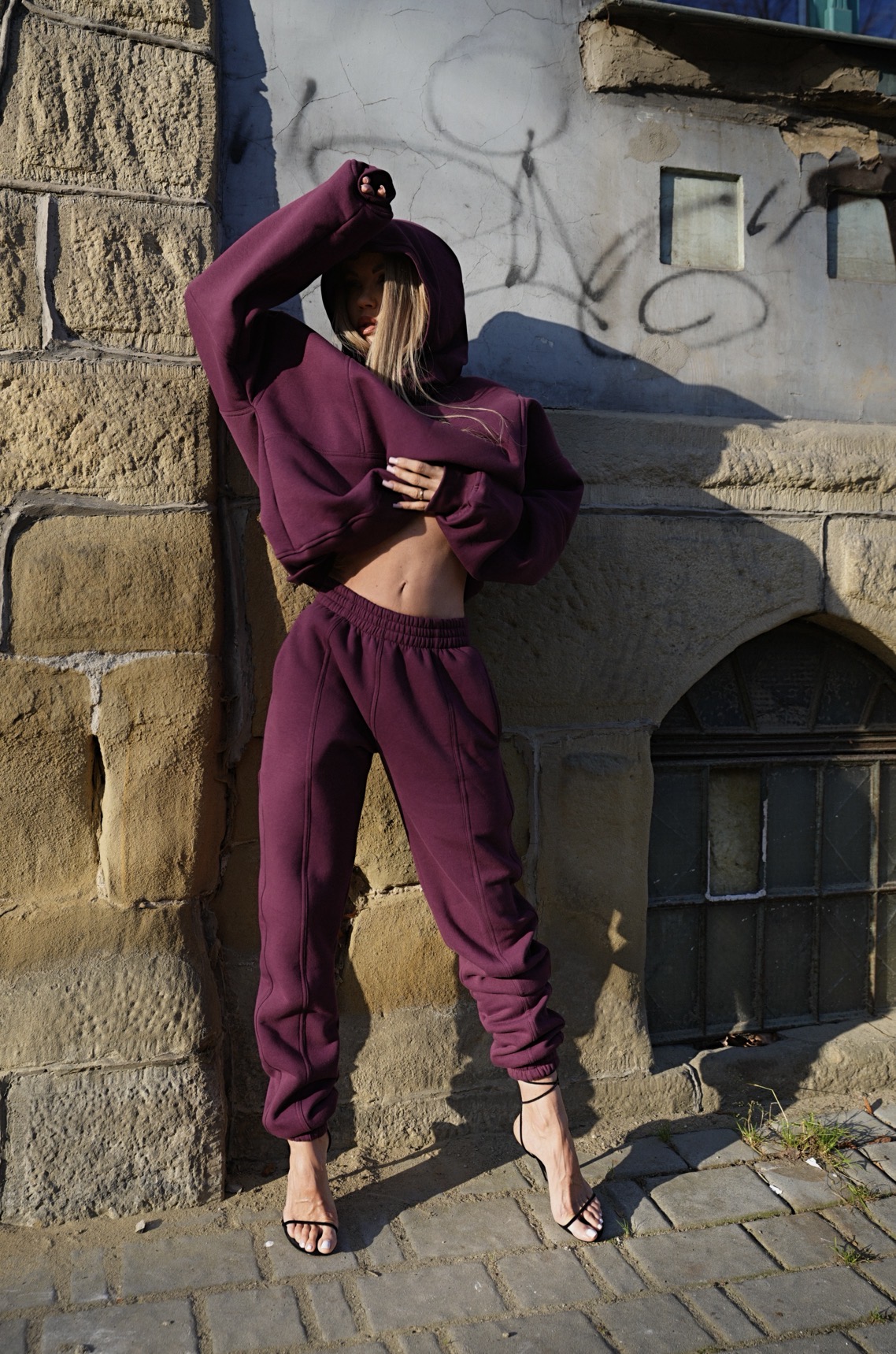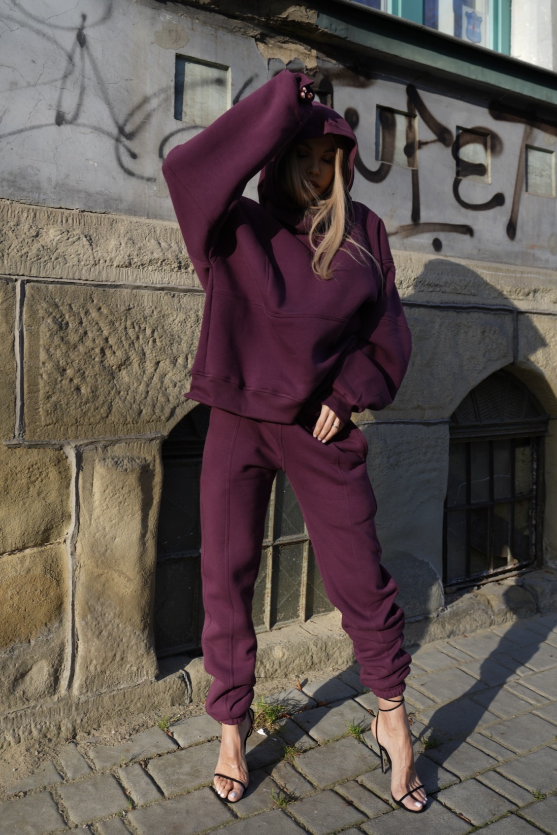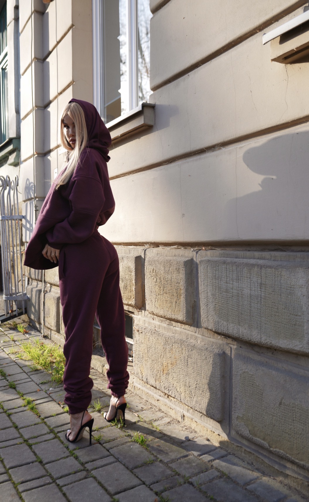 Spodnie dresowe w kolorze głębokiego burgundu, wykonane z miękkiej, przyjemnej dla skóry dzianiny dresowej premium. Materiał jest elastyczny, komfortowy i idealny do codziennego noszenia.